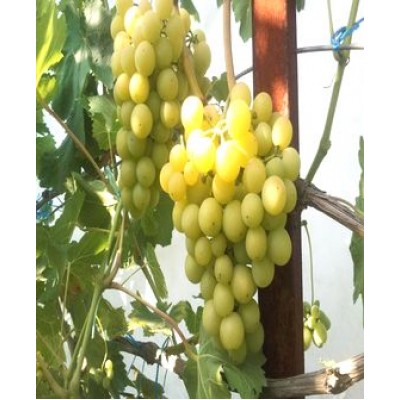 Виноград крупный, круглой формы, масса одной ягоды 8-10 гр., цвет белый. При солнечном свете жёлтые ягоды, внутренности ягод с хрустинкой, вкусовой оттенок приятный с мускатом. Созревание побега отличное. Резистентность к грибку - высокая. Переносимость морозных условий исследуется.